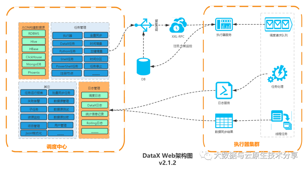 DataX 是阿里云 DataWorks数据集成 的开源版本,在阿里巴巴集团内被广泛使用的离线数据同步工具/平台。DataX 实现了包括 MySQL、Oracle、OceanBase、SqlServer、Postgre、HDFS、Hive、ADS、HBase、TableStore(OTS)、MaxCompute(ODPS)、Hologres、DRDS 等各种异构数据源之间高效的数据同步功能。