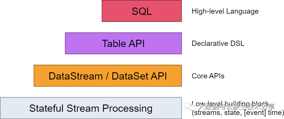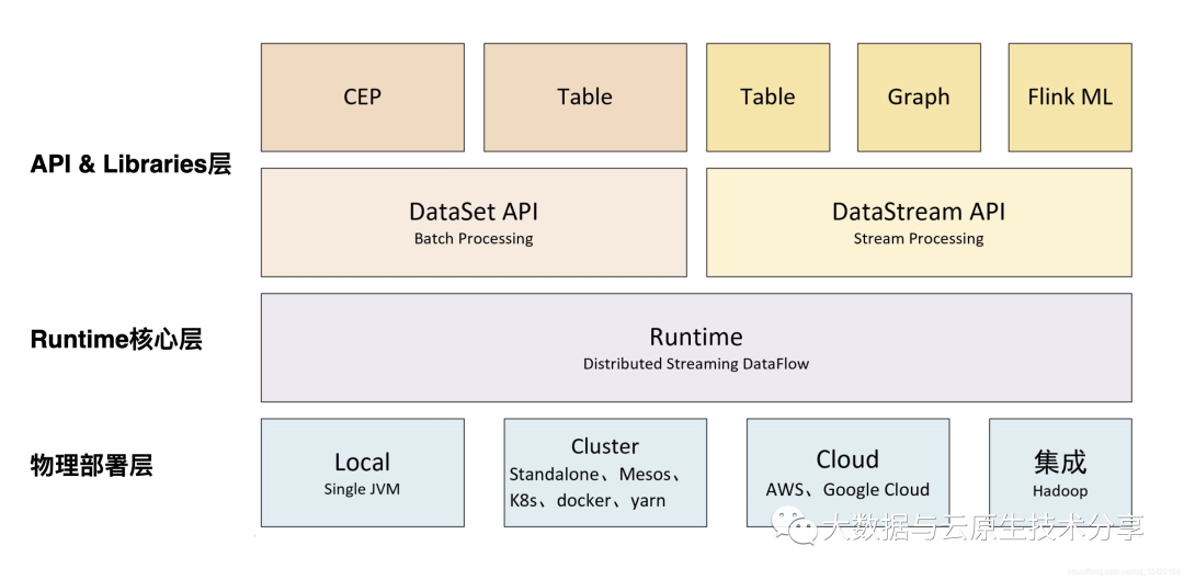 Flink核心是一个流式的数据流执行引擎,并且能够基于同一个Flink运行时,提供支持流处理和批处理两种类型应用。其针对数据流的分布式计算提供了数据分布,数据通信及容错机制等功能。基于流执行引擎,Flink提供了跟多高抽象层的API便于用户编写分布式任务,下面稍微介绍一下Flink的几种API: