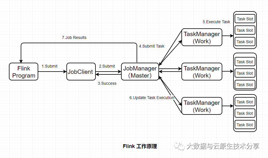 TaskManager:TaskManager运行在不同节点上的JVM进程,负责接收并执行JobManager发送的task,并且与JobManager通信,反馈任务状态信息,如果说JobManager是master的话,那么TaskManager就是worker用于执行任务。每个TaskManager像是一个容器,包含一个或者多个Slot。