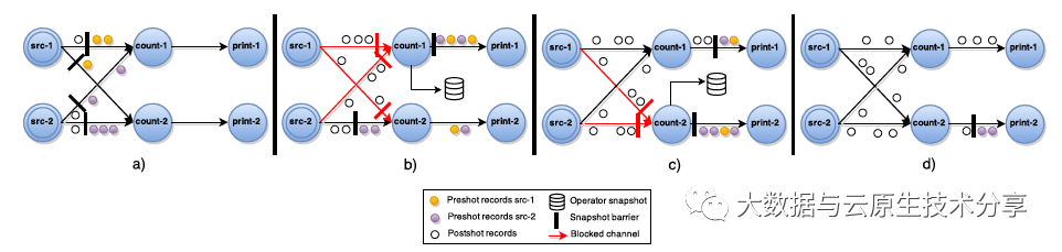 异步屏障快照算法,这个算法基本上是Chandy-Lamport算法的变体,针对DAG(有向无环图)的ABS算法执行流程如下所示: