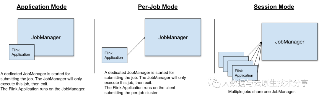 Application模式原本需要客户端做的三件事被转移到了JobManager里,也就是说main()方法在集群中执行(入口点位于ApplicationClusterEntryPoint),Deployer只需要负责发起部署请求了。另外,如果一个main()方法中有多个env.execute()/executeAsync()调用,在Application模式下,这些作业会被视为属于同一个应用,在同一个集群中执行(如果在Per-Job模式下,就会启动多个集群)。可见,Application模式本质上是Session和Per-Job模式的折衷。