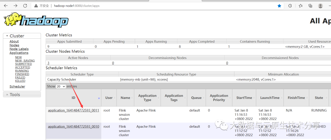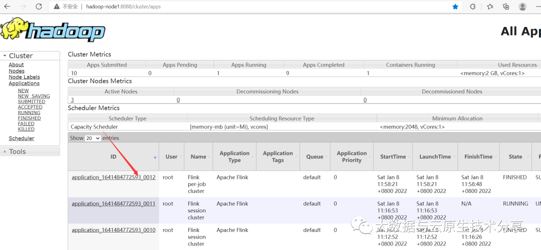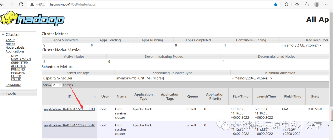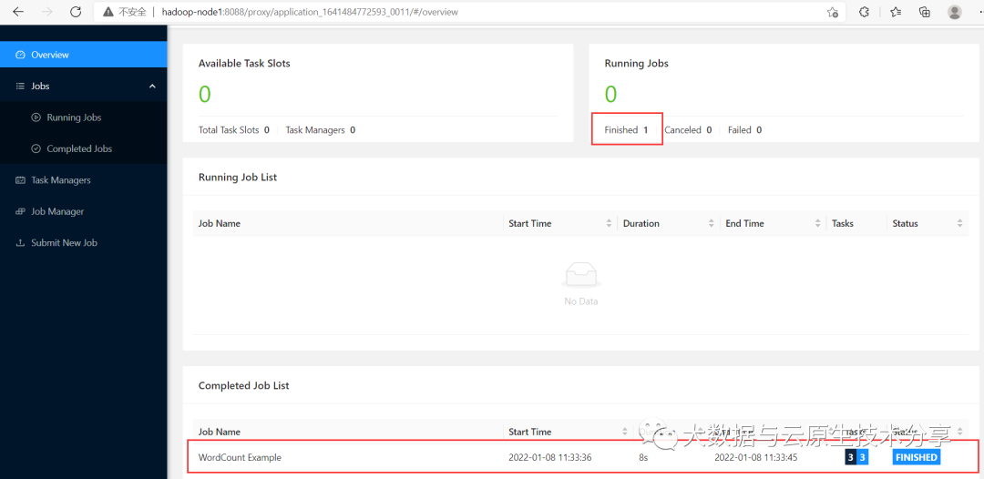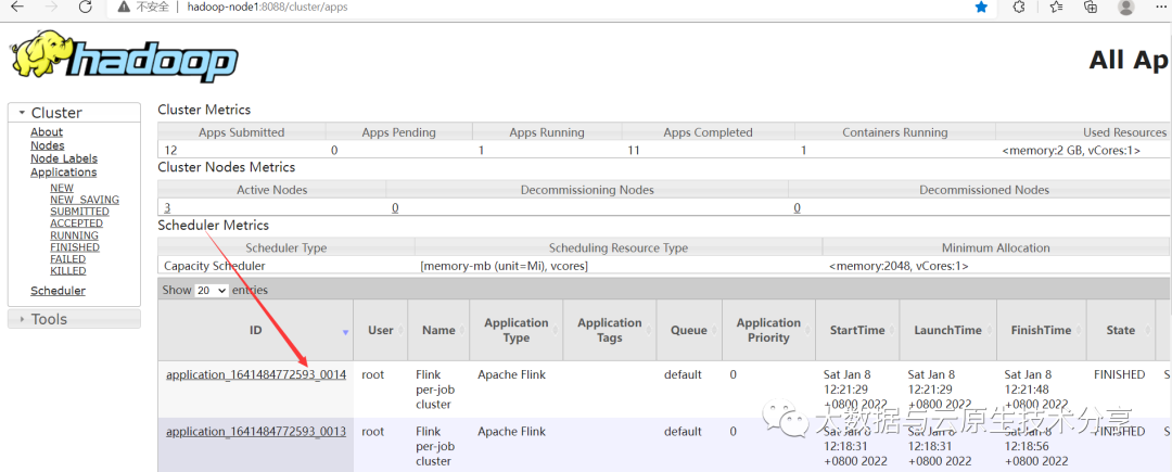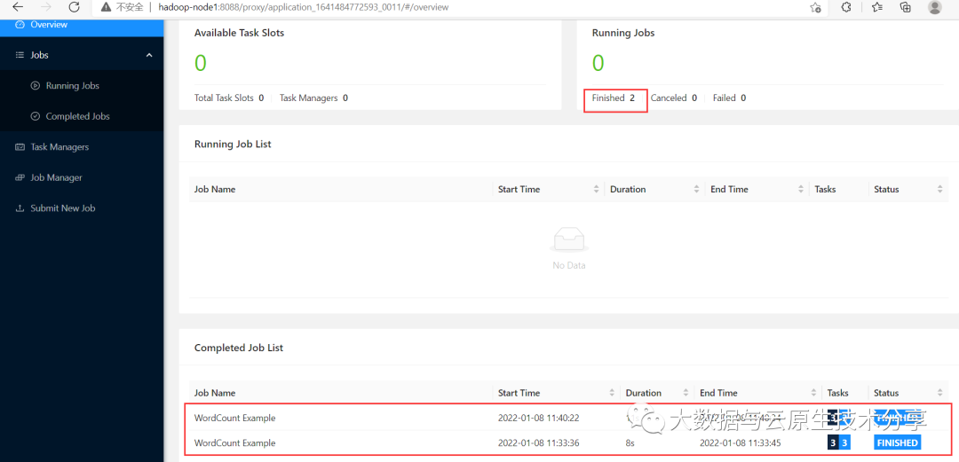 发现现在已经有两个跑完的任务了,但是只有一个flink集群,从而验证了yarn-session模式
