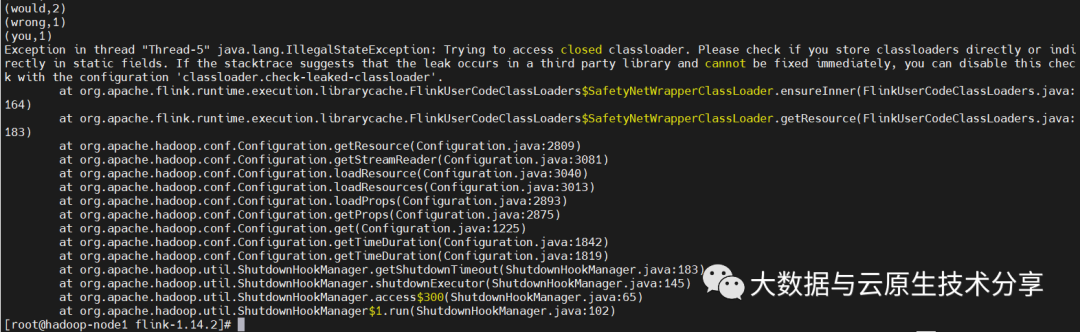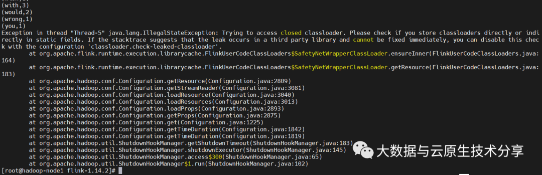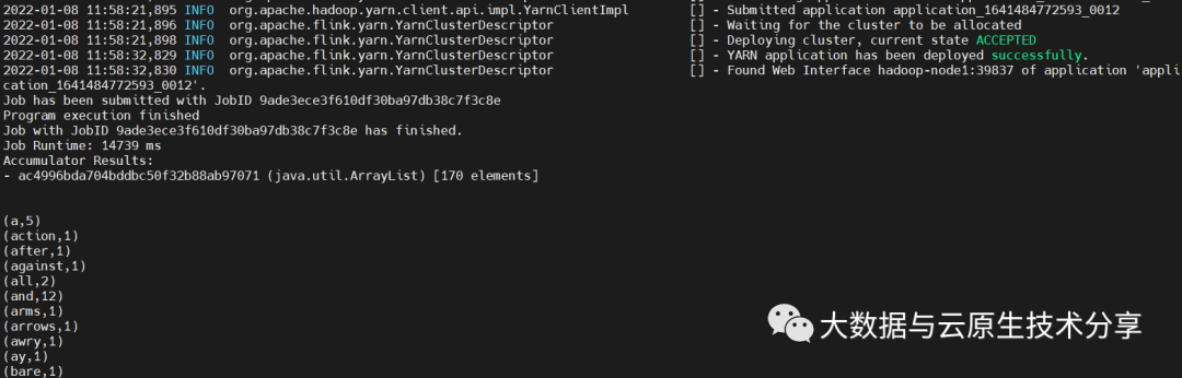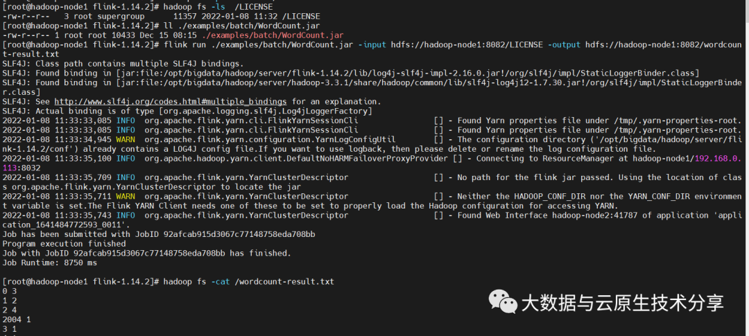 $ flink run ./examples/batch/WordCount.jar -input hdfs://hadoop-node1:8082/LICENSE -output hdfs://hadoop-node1:8082/wordcount-result2.txt
