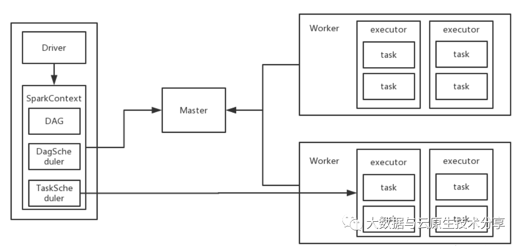 Spark计算平台有两个重要角色,Driver和executor,不论是Standlone模式还是Yarn模式,都是Driver充当Application的master角色,负责任务执行计划生成和任务分发及调度;executor充当worker角色,负责实际执行任务的task,计算的结果返回Driver。