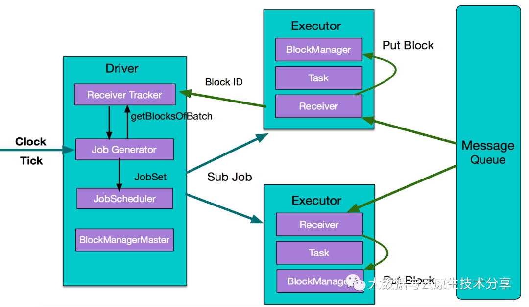 Executor从MessageQueue获取数据并交给BlockManager管理,然后把元数据信息BlockID返给driver的Receiver Tracker,driver端的Job Jenerator对一个batch的数据生成JobSet,最后把作业执行计划传递给executor处理。