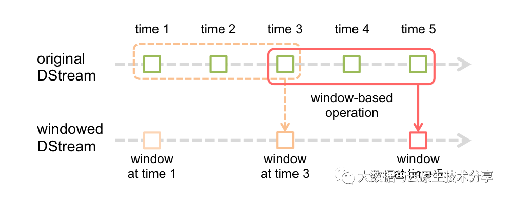 Spark Streaming 还提供窗口计算,允许您在数据的滑动窗口上应用转换。下图说明了这个滑动窗口: