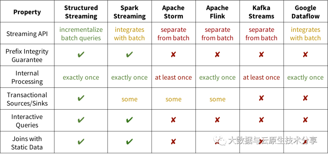 为了展示结构化流的独特之处,下表将其与其他几个系统进行了比较。正如我们所讨论的,Structured Streaming 对前缀完整性的强大保证使其等同于批处理作业,并且易于集成到更大的应用程序中。此外,在 Spark 上构建可以与批处理和交互式查询集成。