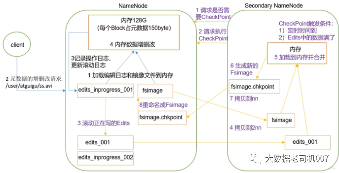 第二步: 然后将具体增删改操作,将FSimage和edit写入内存里进行具体的操作,先写文件,即使宕机了也可以恢复数据,不然先内存数据就会消失,此时2NN发现时间到了,或者edit数据满了或者刚开机时,就会请求执行辅助操作,NN收到后将edit瞬间复制一份,这个时候客户端传过来的数据继续写到edit里。