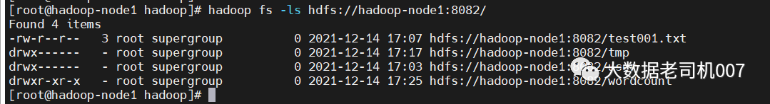 $ hadoop fs -ls hdfs://hadoop-node1:8082/