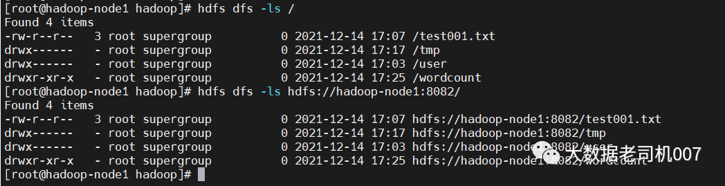 $ hdfs dfs -ls hdfs://hadoop-node1:8082/