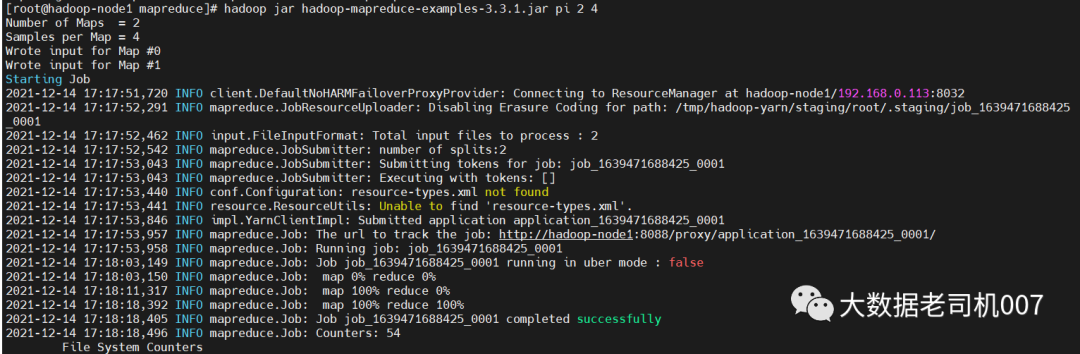$ hadoop jar hadoop-mapreduce-examples-3.3.1.jar pi 2 4