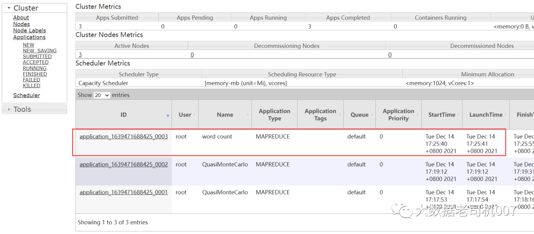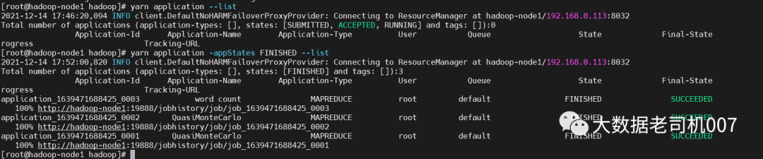 -list #列出RM中的应用程序。支持使用-appTypes来根据应用程序类型过滤应用程序,并支持使用-appStates来根据应用程序状态过滤应用程序。