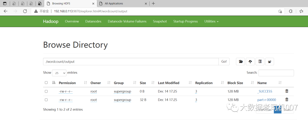 $ hadoop jar hadoop-mapreduce-examples-3.3.1.jar wordcount wordcount/input wordcount/output