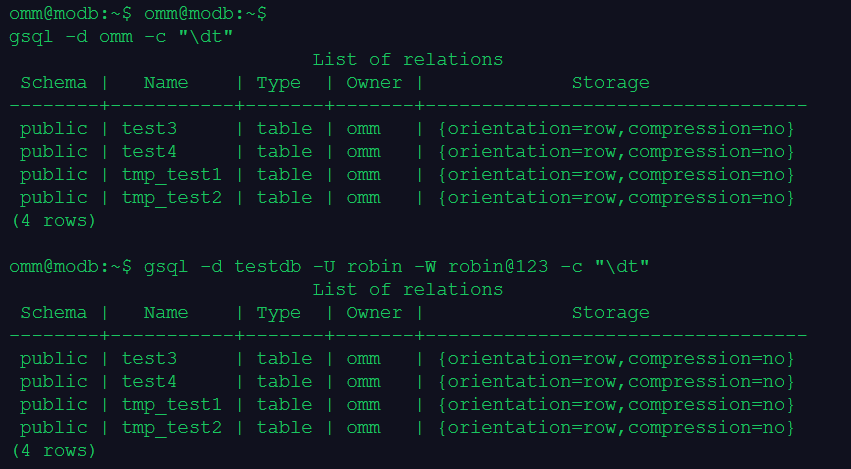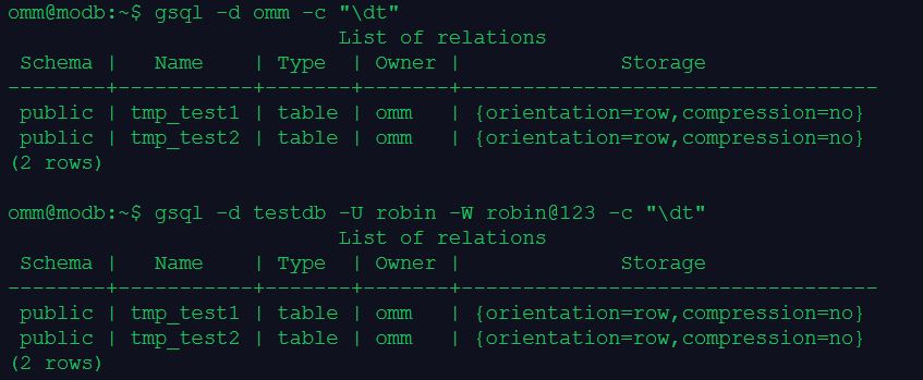 gsql -d testdb -U robin -W robin@123 -c "\dt"
