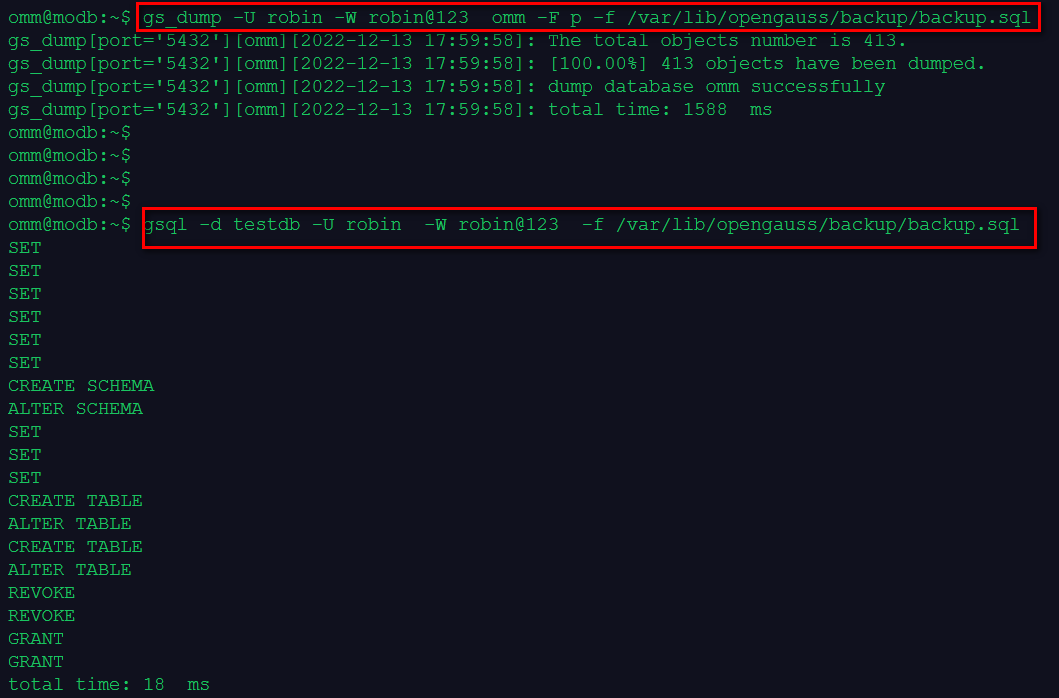 gs_dump -U robin -W robin@123 omm -F p -f /var/lib/opengauss/backup/backup.dump
