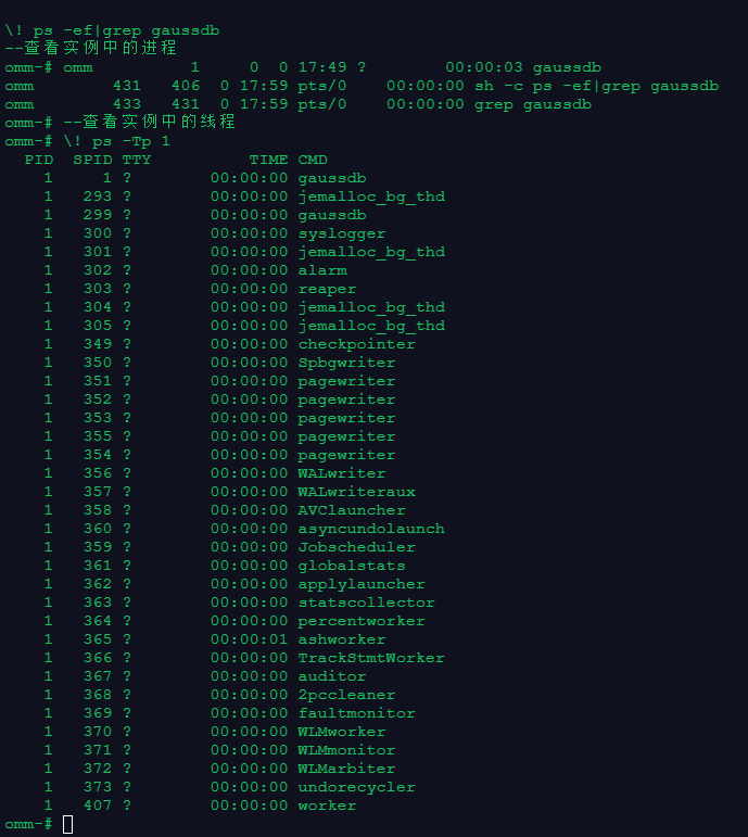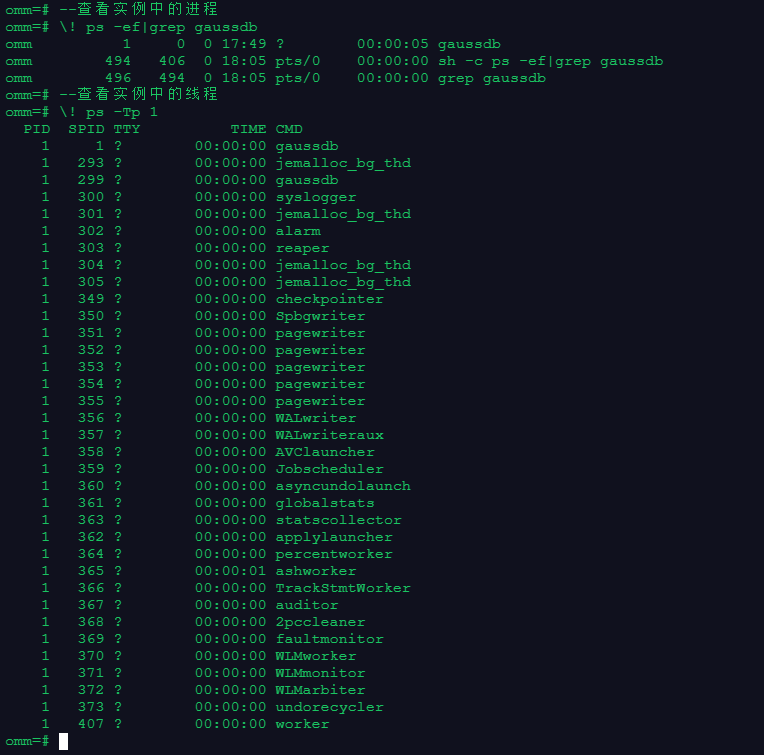 --查看实例中的进程 \! ps -ef|grep gaussdb --查看实例中的线程 \! ps -Tp 1