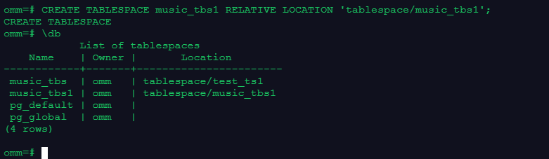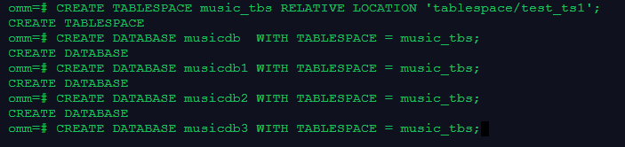 CREATE TABLESPACE music_tbs RELATIVE LOCATION 'tablespace/test_ts1';