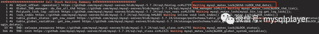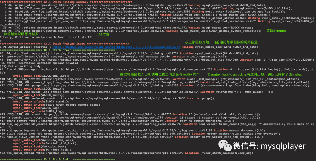 1.  首先,在callstack日志筛选出每个线程调用inline_mysql_mutex_lock前的函数,以及对应的mutex代码位置,此处便是线程在等待的mutex。