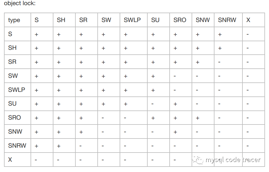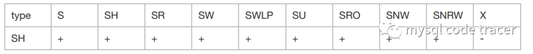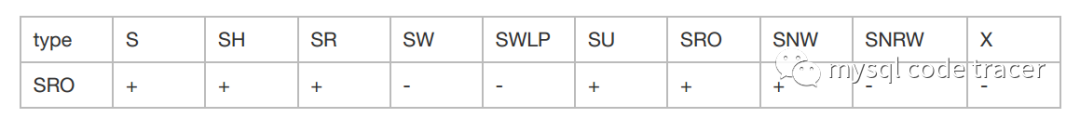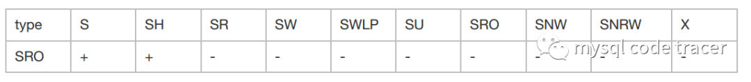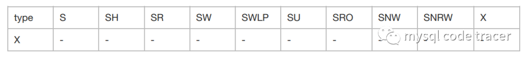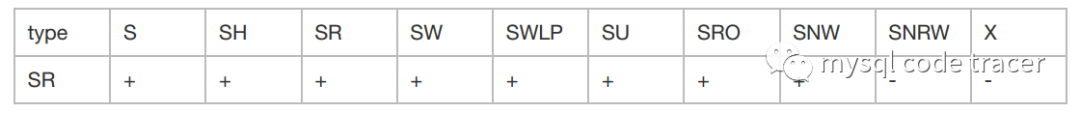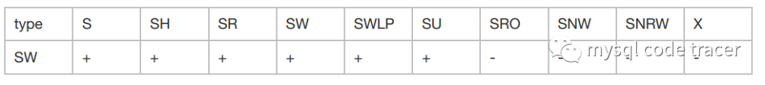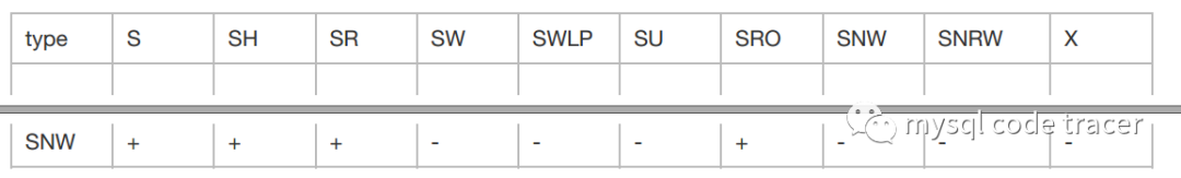 SU可以升级为SNW而SNW可以升级为X,如前面所提及的用于ALGORITHM=COPY 中,保护数据的一致性。先看看它的兼容性如下: