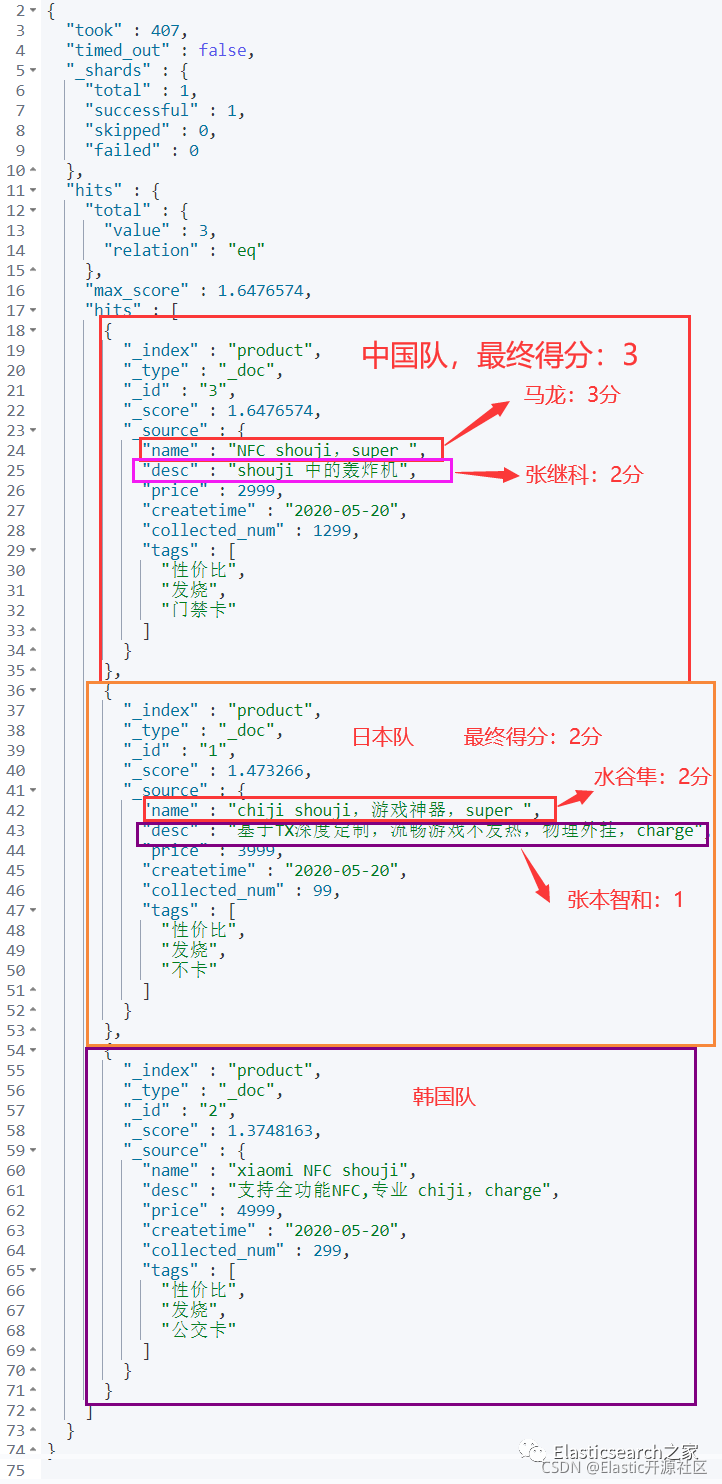 GET product/_search{"query": {"dis_max": {"queries": [{"match": {"name": {"query": "chiji shouji","boost": 2 # name字段评分两倍权重}}},{"match": {"desc": "chiji shouji"}}],"tie_breaker": 0.3}}}