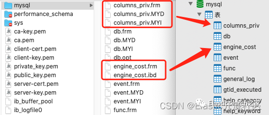 左侧是MySql安装文件的data目录,右侧使我们使用数据库客户端打开数据库后的样式,左侧文件分别对应了右侧数据库中的数据库名,我们以“mysql”这个数据库为例,文件夹中每个文件都有若干个不同后缀的同名文件,分别对应右侧某个数据表,不同的后缀代表不同的数据类型,其中.frm文件代表当前文件存储的是数据表的表结构,.MYD和.MYI文件则代表了当前文件是myisam存储引擎下的数据文件和索引文件,.ibd则代表当前文件是innodb存储引擎下的索引文件,只不过innodb的数据和索引使用了同一个文件。