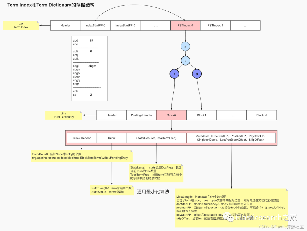 所谓normalization其实是一个如去重、时态统一、大小写统一、近义词处理等类似的相关操作;词项索引就是为了加速词项字典检索的一种数据结构,落地文件为.tip。.tip文件和.tim文件的数据结构如下图2-2所示:
