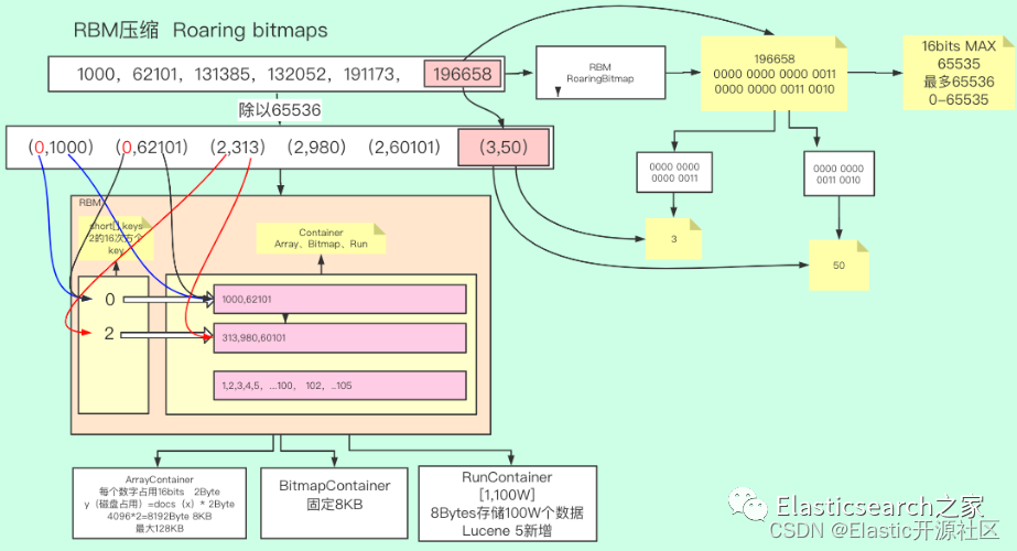 如果你足够细心,你也许会发现其实上述例子中的数组仍然具有一定的特殊性。没错,他是一个稠密数组,可以理解为是一个取值区间波动不大的数组。如果倒排表中出现这样的情况:[1000W, 2001W, 3003W, 5248W, 9548W, 10212W, ... , 21Y],情况将会特别糟糕,因为我们如果还按照FOR的压缩算法对这个数组进行压缩,我们对其计算dealta list,可以发现其每个项与前一个数字的差值仍然是一个很大的数值,也就意味着dealta list的每个元素仍然是需要很多bit来存储的。于是Lucene对于这种稀疏数组采用了另一种压缩算法:RBM(Roaring Bitmaps)