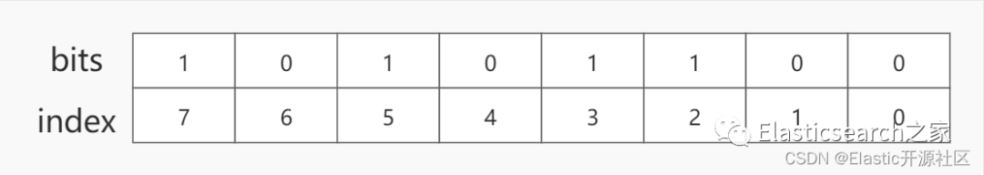 第二种是BitmapContainer,理解BitmapContainer之前首先要了解什么是bitmap。以往最常见的数据存储方式都是二进制进位存储,比如我们使用8个bit存储数字,如果存十进制0,那二进制就是 0 0 0 0 0 0 0 0,如果存十进制1,那就是 0 0 0 0 0 0 0 1,如果存十进制2,那就是 0 0 0 0 0 0 1 1,用到了第二个bit。这种做法在当前场景下存储效率显然不高,如果我们现在不用bit来存储数据,而是用来作为“标记”,即标记当前bit位置商是否存储了数字,出的数字值就是bit的下标,如下图3-5所示,就表示存储了2、3、5、7四个数字,第一行数字的bit仅代表当前index位置上是否存储了数字,如果存储了就记作1,否则记为0,存储的数字值就是其index,并且存储这四个数字只使用了一个字节。