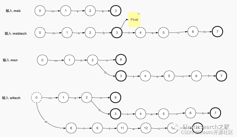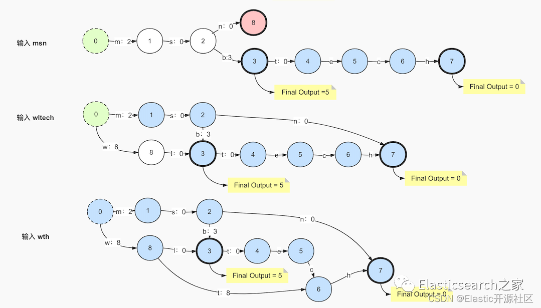 输入第三个term:msn,节点2产生了第二个出度:n,2 < 5,根据"通用最小化"法则,2和5有公共部分:2,5倍拆分成了2和3,此时公共前缀为“ms”,前面以“ms”为前缀的所有term都讲重新计算出度output,此时3需要满足:不能存放在公共前缀“ms”上,并且也不能在第二条出度“n”上,因此只能存放在出度b上,因为b在当前节点2第一条出度的链路上是最靠前的位置。这里FST和Trie最大的区别就是FST不仅使用了公共前缀,而且还计算了公共后缀,“msn”的最终节点会指向节点7,和节点6的出度h共享终止节点。
