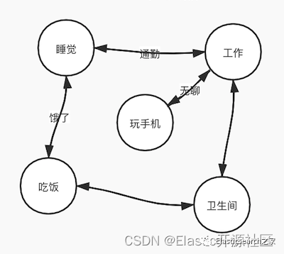 通常我们在计算机的语言中标示一件事物,都会通过某种数学模型来描述。假如现在我们要描述一件事:张三一天的所有活动。这里我们采用了一种叫做FSM(Finite State Machine)的抽象模型,如图5-1所示,这种模型使用原型的节点标示某个“状态”,状态之间可以互相转换,但是转换过程是无向的。比如睡觉醒了可以去工作,工作累了可以去玩手机;或者工作中想去上厕所等等。在这个模型中,标示状态的节点是有限多个的,但状态的转换的情况是无限多的,同一时刻只能处于某一个状态,并且状态的转换是无序切循环的。