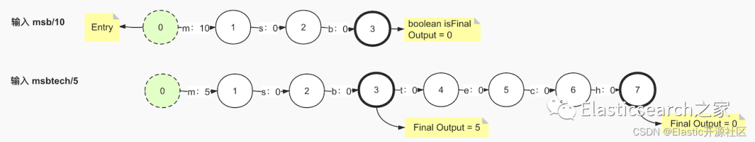 当第二个term:msbteach被写入的时候,其输出值5与msb的输出值10发生了冲突,这时,通用最小化算法法则再次发挥了功效。数字虽然不能像字符那样以前缀作为复用手段,但是数字是可以累加的,10可以拆成两个数字5,这样10和5就产生了公共部分,即5,所以这个时候m的输出值就需要改成5,那另一个5就需要找一个合适的位置,然而把它存放在任何一个节点的出度上似乎都会影响msbtech的计算结果,为了避免这个问题,可以把这个多出来的属于msb的输出值存入msb的final节点的final output中,节点的final output只会在当前出度是输入值的最后一个字符并且出度的target指向的是final节点的时候,才会参与计算。因此此时的msb和msbtech就各自把输出值存入了合适的位置,互不影响而且做到了“通用最小化”原则。