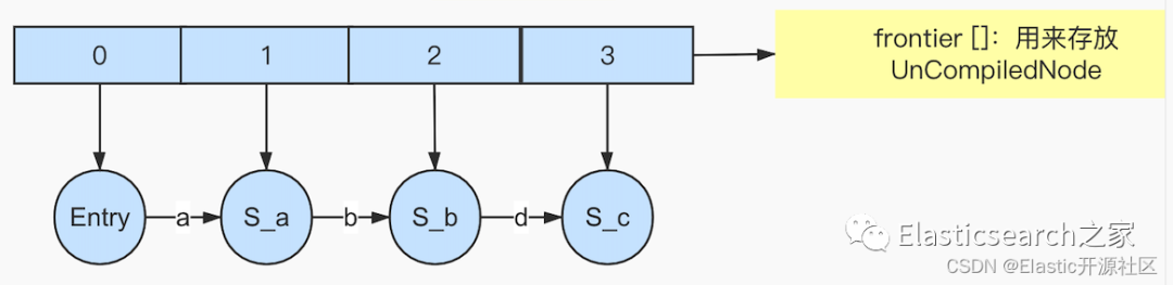 如图6-1所示,假设次数输入第一个Term,此时当前term所有的字符都不会被处理,因为FST的构建是遵循“尾部冻结”的规则的。那么什么是尾部冻结呢?首先我们知道FST最终会被构建成一个FST对象,那这个对象最终转换成二进制对象存储在一个BytesStore对象中,,在Lucene 8.7.0中,BytesStore中封装了一个byte[]类型的数组:current,current数组就是专门存储经过处理之后的节点(CompiledNode)的,当然经过处理后的节点以及其出度的信息都会被转换成二进制存储在current数组中,BytesStore可以理解为是一个字节数组的增强版,是新版本Lucene对current数组的优化,当构建的FST对象大于1GB的时候就会使用BytesStore可以理解为是一个字节数组的增强版对象来存储,否则使用current数组。那么什么时机才是“Compiled”这个动作最好的时机呢?也就是什么时候才是我们从CompiledNode数组中摘下来节点并且计算结果存放在current中的最好时机呢?当然就是等当前节点不会再发生任何变化的时候,因为只有当节点的所有属性都不再发生改变的时候,记录它的描述才是有意义的。那什么时候才能确定它不再会发生改变了呢?以图4-1中的Term Dictionary为例,FST的构造器Builder会在输入第一个term的时候在其构造函数中创建一个长度为10的默认的frontier数组: