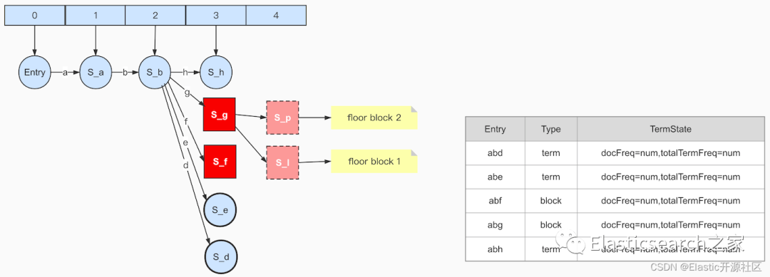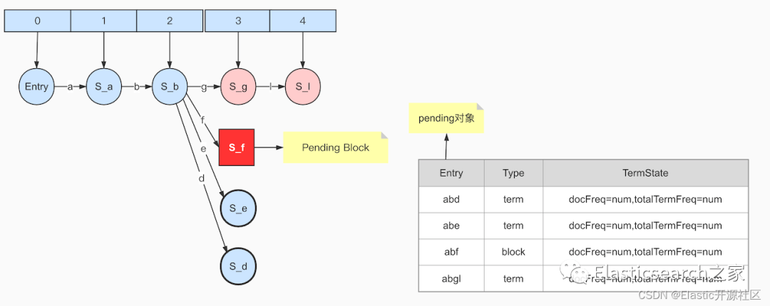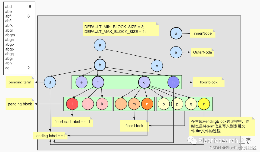 private static final class PendingTerm extends PendingEntry {public final byte[] termBytes;public final BlockTermState state;public PendingTerm(BytesRef term, BlockTermState state) {...}@Overridepublic String toString() {...}}private static final class PendingBlock extends PendingEntry {public final BytesRef prefix; //block前缀的长度(有leading label需要+1)public final long fp; //block在tim文件中的起始位置public FST<BytesRef> index; //第一个PendingBlock的FSTIndex的二进制对象public List<FST<BytesRef>> subIndices; //PendingBlock中嵌套的PendingBlock集合public final boolean hasTerms; //是否包含至少一个完整的的Term(即"非Block"也就是PendingTerm)public final boolean isFloor; //是否是floorBlock,即层级块public final int floorLeadByte; //即leading label 如果不是floor block生成的PendingBlock 那么返回-1...}
