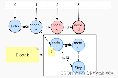 处理顺序:节点从后往前,Stop Node => node c(arc:d)=> node a(arc:b、c)