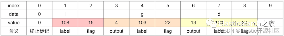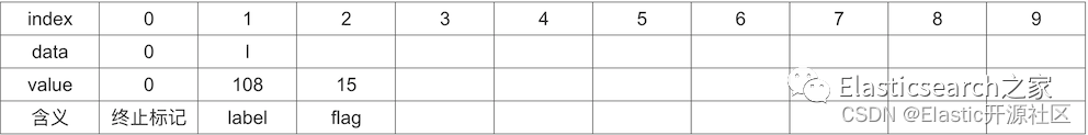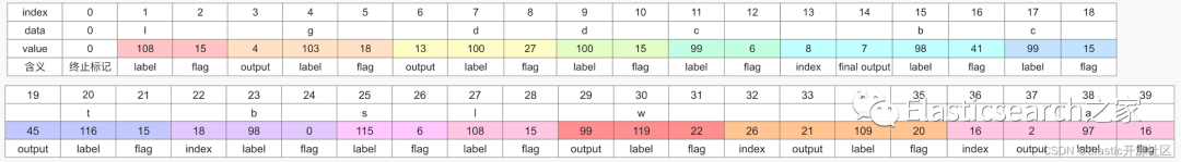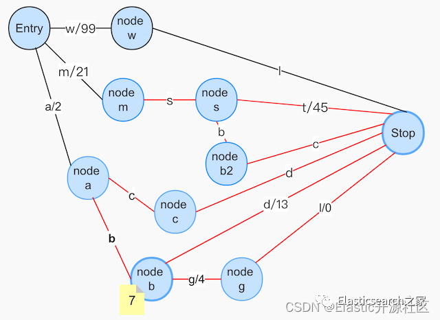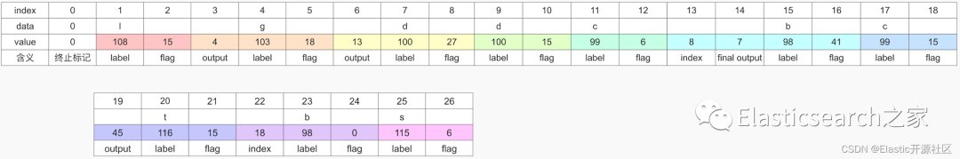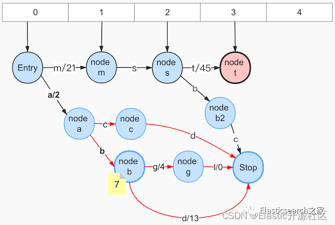 1.从index:39开始,此时key = 'a',当读到index : 36,此时target index指向16,index : 16的位置存储的label为'b',此时key = "ab",final output = 7即可判断当前为终止节点,这里就不用计算flags了,即此时读取到term:ab,此时Term Dictionary中包含一个term:ab,value = 2+7,即:term:ab/9。2.由于index : 16中index指向index : 8,此时key = abd,flags = 27,27有唯一的flag组合:16 + 8 + 2 + 1,即BIT_ARC_HAS_OUTPUT、BIT_STOP_NODE、BIT_LAST_ARC、BIT_FINAL_ARC的组合,由BIT_STOP_NODE可得当前是终止节点,所以此时读取到term:abd,value = 2 + 13 = 15 ,即:term:abd/15。此时Term Dictionary中包含两个元素:term:ab/9、term:abd/15。3.由于index : 8的Arc d没有target index,因此继续沿着数组往下读,即读取index : 5,即Arc g,通过前面的flags值计算可得此时key = "abg", Arc g仍然没有target index,因此继续读取index : 2,同理可得此时key = "abgl",继续读或者通过flags都可以判断当前是一个终止节点,所以此时得到term:abgl,value = 2 + 4 = 6,即term:abgl/6。此时Term Dictionary中包含三个元素:term:ab/9、term:abd/15、term:abgl/6。4.此时node a的第一个出度Arc b已经遍历完毕,即index : 16后面的数据已经读取完毕,此时读取'b'在current数组中的顺序数据,即index : 12,原理同上,读至index : 10,由flags可得当前为终止节点,此时得到term:acd/2。此时Term Dictionary中包含四个元素:term:ab/9、term:abd/15、term:abgl/6、term:acd/2。5.此时Entry的第一个出度Arc a的所有信息都已经遍历完成,即index : 39的target index后面的数据以及读取完毕,按照current数组顺序读取至index : 35,根据其target index : 26读取到Arc s,顺序读至index : 24,根据其target index读至index : 18,再根据当前Arc c的flag的到term:msbc,value = 21。即:term:msbc/21。此时Term Dictionary中包含五个元素:term:ab/9、term:abd/15、term:abgl/6、term:acd/2、term:msbc/21。6.此时node s的第一个出度Arc b遍历完毕,沿着Arc b顺序读取至index : 21,计算flags可得当前节点为Stop node,即得到term:mst,value = 21 + 45 = 66,即term:mst/66。此时Term Dictionary中包含六个元素:term:ab/9、term:abd/15、term:abgl/6、term:acd/2、term:msbc/21、term:mst/66。7.此时Entry的第二个出度Arc m的所有信息已经读取完毕,沿着index : 35继续往后顺序读取,读取index : 31,然后顺序读取至index : 28,通过计算flags可得当前节点为终止节点,即得到term:wl,value = 99,即term:wl/99,此时Term Dictionary中包含七个元素:term:ab/9、term:abd/15、term:abgl/6、term:acd/2、term:msbc/21、term:mst/66、term:wl/99。