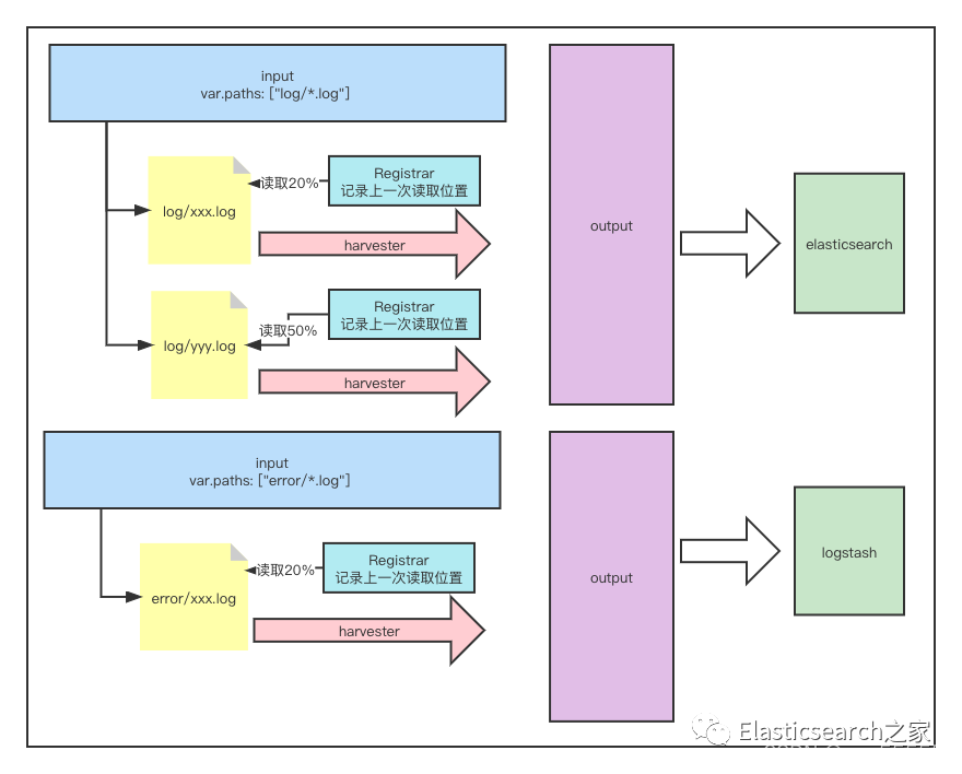 •harvester: harvester用于按行读取单个文件的内容。每个文件都会启动一个harvester,harvester负责打开和关闭文件。filebeat中还有一个Registrar组件用于记录文件的偏移量,即上一次读取的位置,下一次打开文件时会从Registrar读取偏移量然后继续读取数据•input:负责管理harvester并且找到所有符合读取条件的文件。如果输入类型为log,则input会在驱动器上找到与定义的路径符合的文件,并会给每个文件都启动一个harvester.