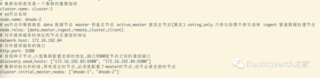 # 集群名称是否是一个集群的重要指标cluster.name: cluster-1# es节点名称node.name: dnode-1# es节点中集群角色 data 数据节点 master 预备主节点 active_master 激活主节点(真实) voting_only 只参与投票不参与选举 ingest 管道数据处理节点node.roles: [data,master,ingest,remote_cluster_client]# 对外提供服务的地址和节点见通信的地址network.host: 172.16.192.83# 对外提供服务的端口http.port: 9200# 发现种子节点,小型集群配置全部的地址,端口9300是节点之间的通信端口discovery.seed_hosts: ["172.16.192.83:9300", "172.16.192.84:9300"]# 集群初始化的时候,用来选主的节点,必须是配置了master的节点,但不必是全部的节点cluster.initial_master_nodes: ["dnode-1", "dnode-2"]