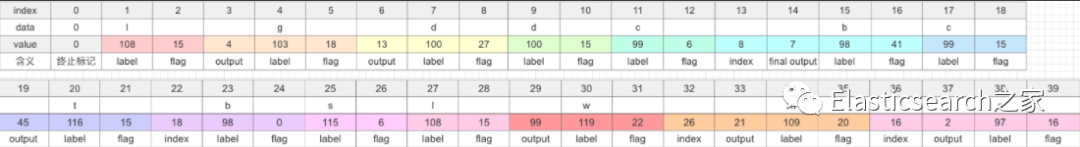 。试想,假如列中包含 10亿 数量级的数据,而英文字幕无非就 26 个,也就是说,字幕 a 我们可能重复存储了上亿次。即便是中文,ES在底层存储的时候,也会通过ASCII来转移为字幕,最终以 bits 存储,这种问题,数量级越大,越严重。实际上这些有公共前缀或公共后缀的地方,我们完全可以只存储一次以追求更高的效率。ES 在数据存储上采用的 FST 这种模型,在保证了高性能的前体系,带来了指数级的存储效率提升,一个TB级的索引,通过FST存储,其构建的模型大小在1GB左右。比如下 图二 就是 图一中词项字典的 FST模型。图三为其二进制序列的十进制展示。这里我们只借鉴思想,而不探究原理,FST 的模型建立过程非常复杂,我在关于倒排索引