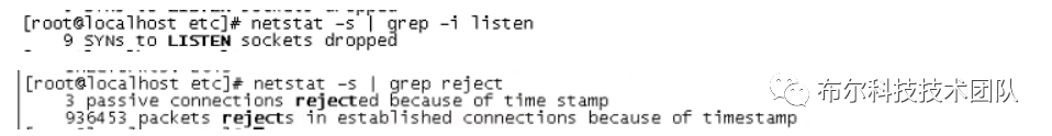 使用cat /proc/sys/net/ipv4/tcp_tw_recycle和cat /proc/sys/net/ipv4/tcp_timestamps发现均被开启,检查TCP包的丢弃情况,如图所示: