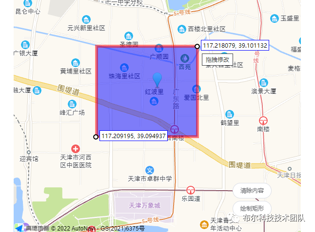说明:由于使用高德地图API mouseTool 插件绘制的矩形只支持多边形编辑,无法控制某个角来实现等比例缩放矩形,故本次开发过程中采用了以下方法实现的等比例调整矩形的需求:用户绘制完矩形的一瞬间记录下其绘制的矩形的四个角的坐标点,然后将用户绘制的矩形删除,根据记录的坐标点,使用 AMap.Rectangle 来重新生成矩形覆盖物,这样便可以使用 AMap.RectangleEditor 来开启矩形的等比例缩放功能了。