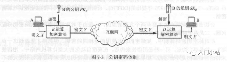 发送者 A 用 B 的公钥 PKB 通过 E 运算对明文 X 加密,得出密文 Y,发送给 B。