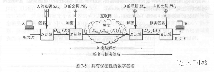 B 用自己的私钥 SKB 通过 D 的运算进行解谜,恢复出明文。