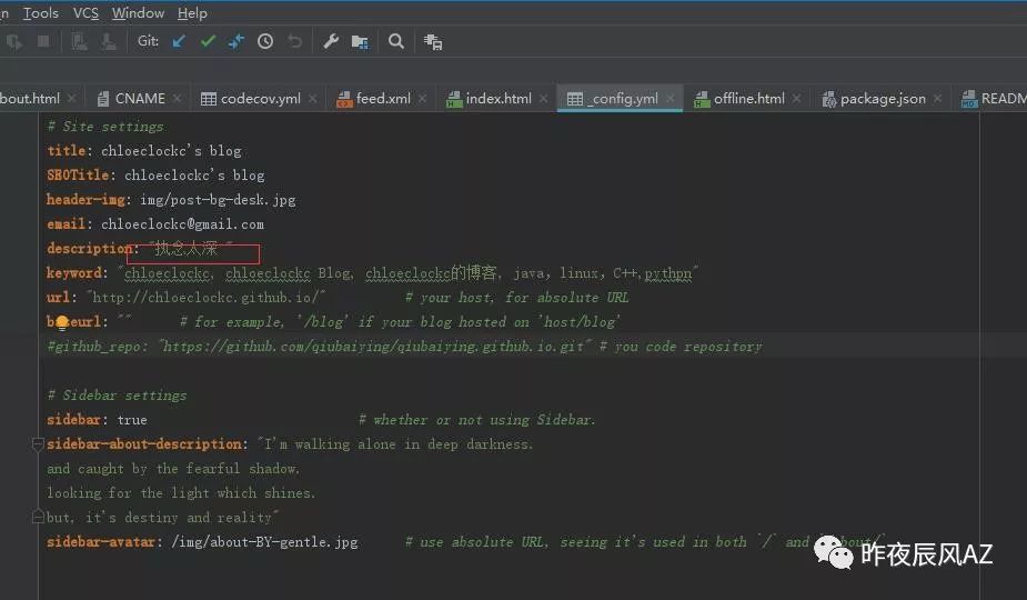 除了图片以外,这里还有一个坑,就是在_config.yml,是有description:的,很容易让人以为是网页blog下面那一行字,其实不是的,真正的是在index里的description。