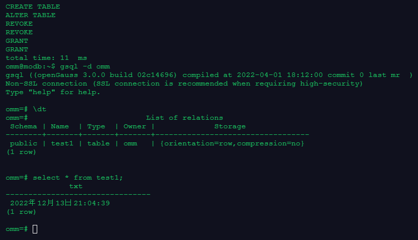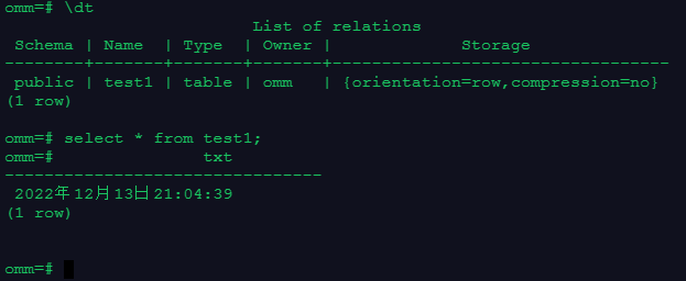 omm=# INSERT INTO TEST1 VALUES('2022年12月13日21:04:39');