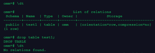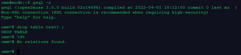 --删除omm数据库的测试表test1omm@modb:~$ gsql -d omm