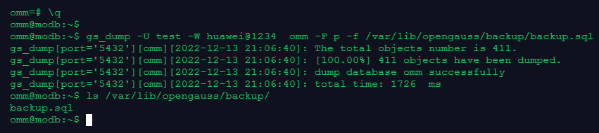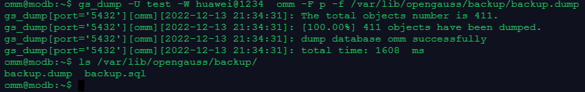 omm@modb:~$ gs_dump -U test -W huawei@1234 omm -F p -f /var/lib/opengauss/backup/backup.dump