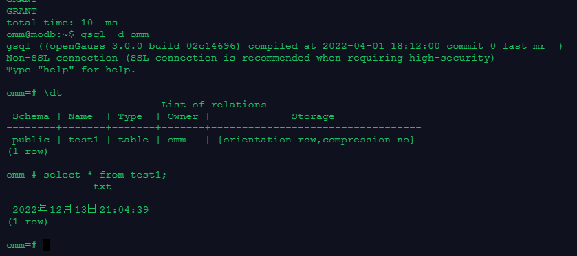 omm@modb:~$ gsql -d omm -U test -W huawei@1234 -f /var/lib/opengauss/backup/backup.sql