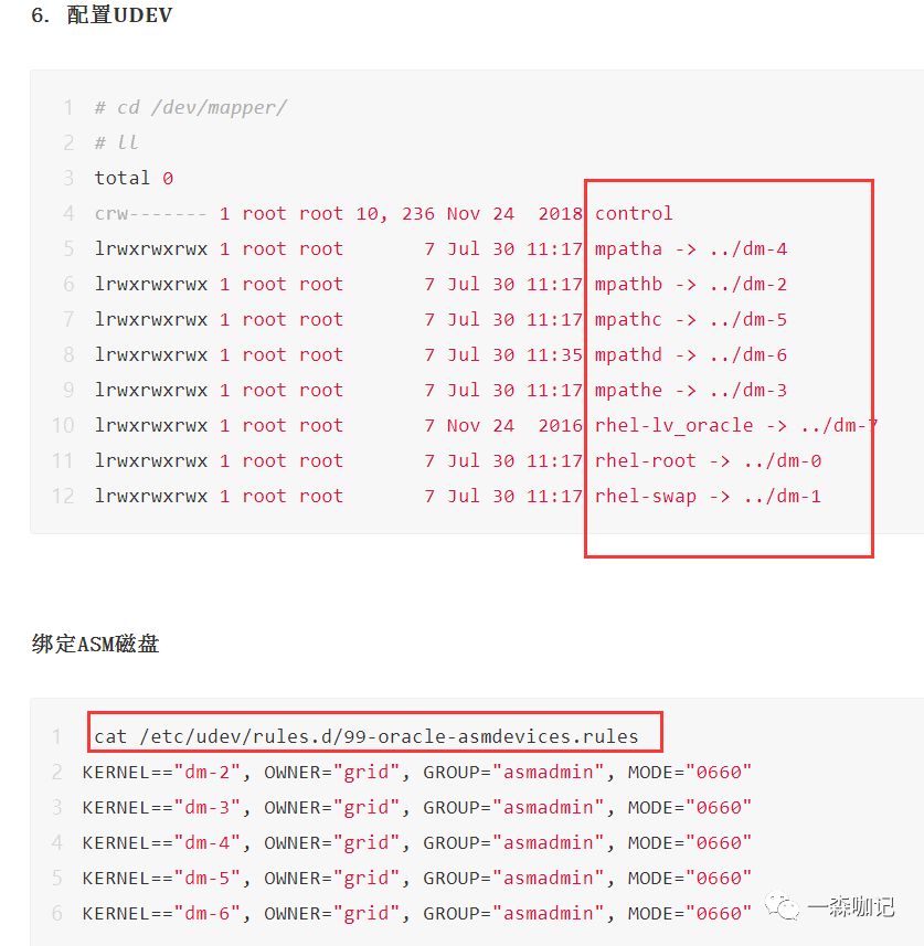 2. 文章重点和之前的11g rac部署最大的不同是本文udev的配置,读者可详细看下;11g中绑定是dm-*,但鉴于服务器每次启动存储文件的加载顺序会改变,所以推荐读者使用本文DM_UUID的方式进行绑定,绑定关系更稳定;