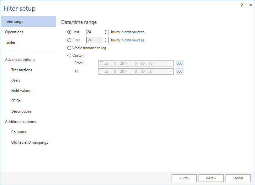 2、使用Time range部分在过滤设置选项步骤里,选择尽可能靠近UPDATE 语句被执行时的时刻以缩小恢复时间段范围 。