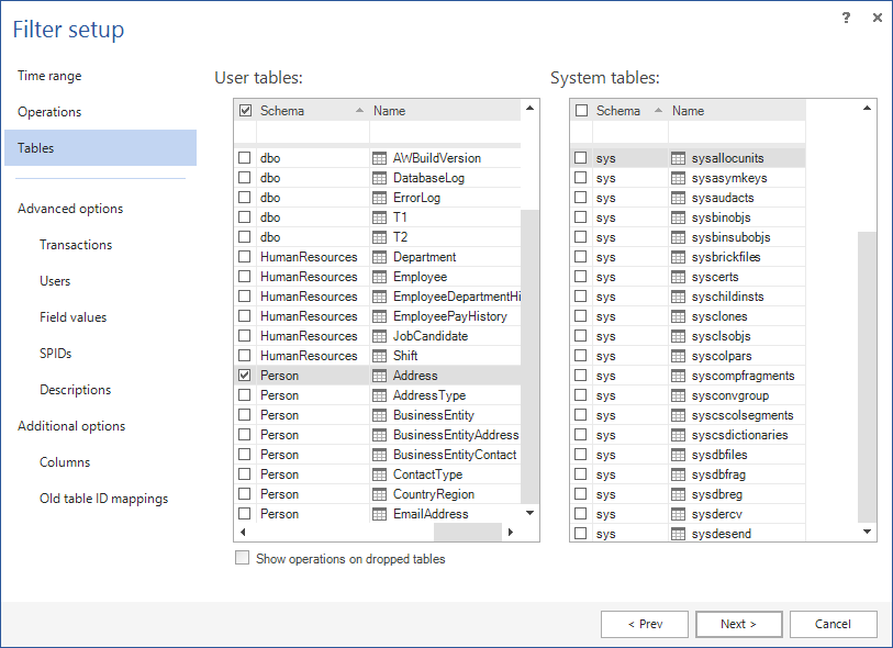 4、选择在过滤设置选项步骤中被更新数据的表,表过滤器